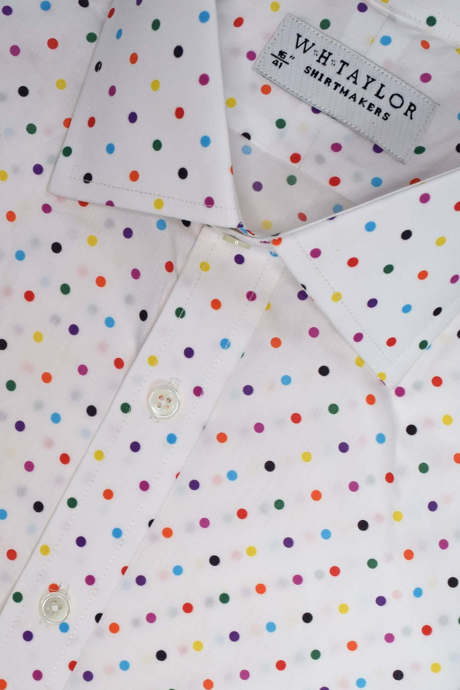 Make a bold statement with the Multi-Coloured Spotted White Men's Bespoke Shirt. Featuring vibrant, multi-hued spots on a crisp white background, this shirt breaks away from the ordinary with its eye-catching design. Precisely tailored to your measurements, it ensures a sharp fit that complements your daring style. Perfect for those who embrace individuality, this bespoke shirt combines playful color with sophisticated craftsmanship to elevate your wardrobe with fearless confidence.